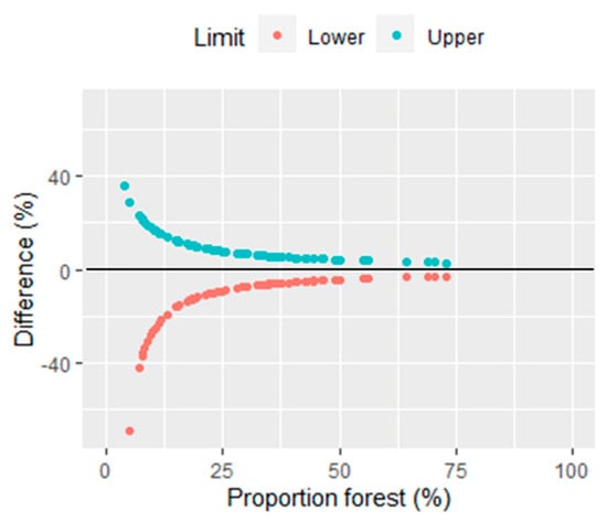 The difference between and is the regression estimator [] for proportion forest (), as follows: