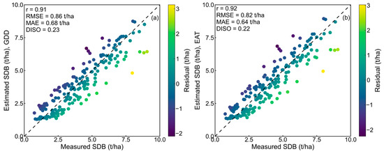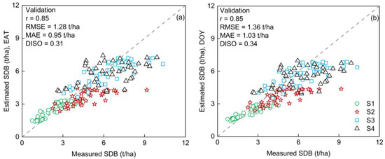 The Tc/Tp-SDB models were divided into temporal (DOY, DAS) and thermal (GDD, EAT) models based on constraint types, and the calibration datasets were used to test the performance of these models (Figure 10). EAT and DAS can be calculated as DAS and DOY plus fixed values, respectively. However, there were differences in the performance of the two model types on the calibration datasets. Therefore, we selected the optimal modeling methods for each type. For the temporal metrics, Tc/Tp-SDB-EAT (r = 0.92, RMSE = 0.82 t/ha, MAE = 0.64 t/ha, DISO = 0.22) performed better than Tc/Tp-SDB-GDD (r = 0.91, RMSE = 0.86 t/ha, MAE = 0.68 t/ha, DISO = 0.23). For the thermal metrics, Tc/Tp-SDB, Tc/Tp-SDB-DOY (r = 0.90, RMSE = 0.92 t/ha, MAE = 0.69 t/ha, DISO = 0.25) performed better than Tc/Tp-SDB-DAS (r = 0.87, RMSE = 1.01 t/ha, MAE = 0.84 t/ha, DISO = 0.30). Based on these results, EAT and DOY were selected as the constraint variables to establish the Tc/Tp-SDB-EAT and Tc/Tp-SDB-DOY models, respectively.