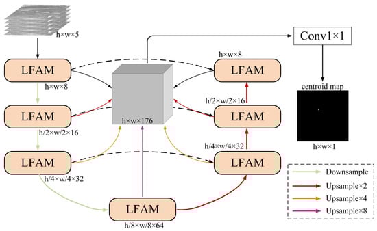 The centroid detection network for weak, small infrared targets proposed in this paper is essentially an innovative transformation of traditional semantic segmentation networks. As shown in Figure 5, the entire network structure inherits the classical encoder–decoder architecture. In this network, both in the encoding and decoding stages, we innovatively apply LFAM to extract motion features of the targets from sequence images. The number of channels for the input image is 5. During the encoding stage, through a feature extraction process that deepens layer by layer, the number of channels in the feature map gradually increases from the initial 5 to 8, 16, 32, and finally 64 channels. This progressive strategy can deeply explore the semantic hierarchy of images and construct a rich feature pyramid. Each additional layer of channels enables the model to accurately capture and distinguish different semantic regions in the image. Constructing a rich feature pyramid from low-level details to high-level semantics through multi-level feature extraction lays a solid foundation for subsequent centroid detection tasks. In the decoding stage, the number of channels in the feature map gradually decreases from 64 to 32, 16, and ultimately to a level similar to the number of input image channels. This operation can accurately restore the spatial details of the image and promote effective fusion and presentation of information. By gradually reducing the number of channels, the model focuses more on converting high-level semantic information into specific pixel-level predictions during the decoding process. At the same time, the model is constantly optimizing and integrating multi-level feature information to ensure that the final output preserves the overall structure of the image while accurately reflecting the proximity of each pixel to the target centroid.