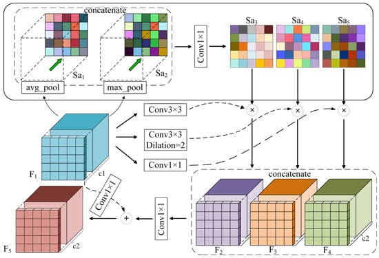 In LFAM, we first perform global average pooling and global max pooling on to initially obtain spatial attention information. Global average pooling constructs a new feature map by averaging the elements within each channel, thereby extracting global information represented by the average features of each channel. This approach is pivotal for comprehending the overall content of an image. Conversely, global max pooling generates a feature map by selecting the maximum value from each channel, emphasizing salient features that are typically the model’s primary focus. Subsequently, this spatial attention information is inputted into a 1 × 1 convolutional layer to adjust the number of channels to 3. Meanwhile, also undergoes convolution with a kernel size of 3 × 3 to obtain , convolution with a kernel size of 3 × 3 and dilation rate of 2 to obtain , and convolution with a kernel size of 1 × 1 to obtain . These operations aim to capture features of the image from different scales. The three feature maps are then multiplied by the three feature maps generated by the spatial attention mechanism to further highlight the spatial features of the target. Subsequently, , , and are concatenated along the channel dimension and inputted into a 1 × 1 convolutional layer to change the number of output feature maps. The purpose of this step is to integrate features extracted by the convolutional neural network at different scales, producing feature maps that encompass information from various scales and possess higher-level semantic content. Finally, the output of this step is added to the feature map of processed by a 1 × 1 convolutional layer to generate the final output feature map, . Specifically, the equations for the calculation of the feature map are as follows: