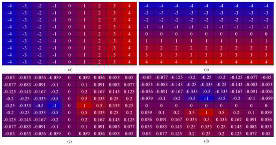 Offset weight maps of the GCM and our proposed WCM: (a) the offset weight map in the x direction for the GCM; (b) the offset weight map in the y direction for the GCM; (c) the offset weight map in the x direction for our proposed WCM; and (d) the offset weight map in the y direction for our proposed WCM.
