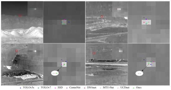 Since the evaluation metrics for YOLOv8n, YOLOv9, and YOLOv10s are all zero, we will not present the performance of these three algorithms on each test scene. Instead, we will only compare the performance of the other eight algorithms on each test scene (as shown in Table 4). It was found that these eight methods had low detection rates in Scene 6 and Scene 13, and a high false alarm rate in Scene 11. This is because the targets in Scene 6 and Scene 13 exhibit low contrast, while Scene 11 contains numerous false alarms that resemble the shape of the targets. All the semantic segmentation algorithms perform poorly on Scene 6, with DNAnet and MTU-Net being particularly significant, with a detection rate of zero. This is because the target size of Scene 6 is very small (about two pixels) and has extremely low contrast with the background. Both DNAnet and MTU-Net employ highly intricate, densely connected network architectures. For small-sized and low-contrast targets, after undergoing numerous convolutions, pooling, and other operations, the differences between them and the background tend to smooth out, making it harder for the network to capture the presence of the targets. Nevertheless, this densely connected network structure enables a more accurate detection of small targets with higher contrast. This explains why DNAnet and MTU-Net outperform UCDnet in the remaining test scenes. The performance of these eight methods in the four test scenes is shown in Figure 8.