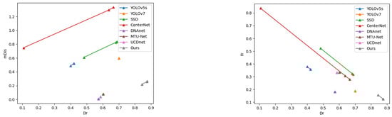 Currently, nearly all related studies are concentrated on bounding box detection or the semantic segmentation of infrared small targets, with centroid detection being relatively rare. Therefore, we compared several mainstream and practical methods for small infrared target bounding box detection and semantic segmentation, including DNAnet [], YOLOv5, YOLOv7 [], YOLOv8, YOLOv9 [], YOLOv10 [], SSD [], CenterNet [], MTU-Net [], and UCDnet []. Apart from UCDnet, which is an algorithm proposed by us in paper, the codes of the other comparative algorithms are sourced from the original source codes provided by the respective authors on GitHub. In other words, the source codes of all algorithms utilized in this paper are provided by their respective authors. Each author specifies the format of the dataset that is required for their algorithm to function correctly. Rather than modifying the algorithms to accommodate our dataset, we adjust the format of the labels in our dataset to comply with the requirements of each algorithm.