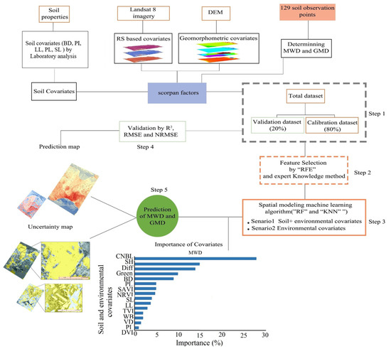 Our study follows a sequential workflow described in (Figure 1). The main steps were to (i) compile a database including soil observations of SAS indices for the top soil layer (0 to 30 cm) coupled with the environmental covariate, (ii) select the effective environmental covariates through the recursive feature elimination (RFE) method, (iii) model SAS indices using RF and k-NN MLAs based on two scenarios S1 [all covariates (RS indices, topographic attributes, and soil covariates)] and S2 (considering only topographic and RS covariates), (iv) evaluate the performance of each MLA based on conventional model validation criteria, and (v) map both the SAS indices of interest, MWD and GMD, alongside their associated uncertainties. Our reason for adopting a scenario-based approach was to examine how the same model would perform given a varying number of covariates. Particularly, we would be able to establish whether fewer variables, relative to more, would yield a parsimonious outcome or not.