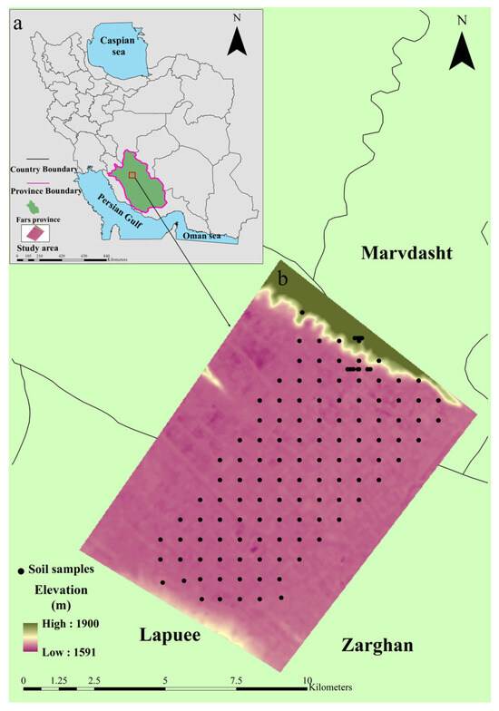 Location of the Fars province in Iran (a), the Lapuee Plain (b), and soil sample points across the study area.