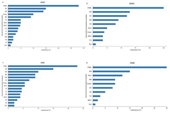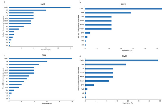 Results of ranking the environmental variable’s importance (%) for prediction of soil aggregate stability (SAS) indices (mean weight diameter (MWD), and geometric mean diameter (GMD)) using random forest (RF) model. (a,c) related to scenario S1 (including RS indices, topographic, and soil covariates) and (b,d) related to scenario S2 (including RS indices and topographic covariates). CNBL: Channel Network Base Level, SH: Standardized Height, Diff: Diffuse Insolation, WB: Watershed Basins, VD: Valley Depth, Green: Greenness, SAVI: Soil Adjusted Vegetation Index, NRVI: Normalized Ratio Vegetation Index, DVI: Difference Vegetation Index, TVI: Transformed Vegetation Index, PL: Plastic Limit, SL: Shrinkage Limit, LL: Liquid Limit, PI: Plasticity Index, BD: Bulk density.