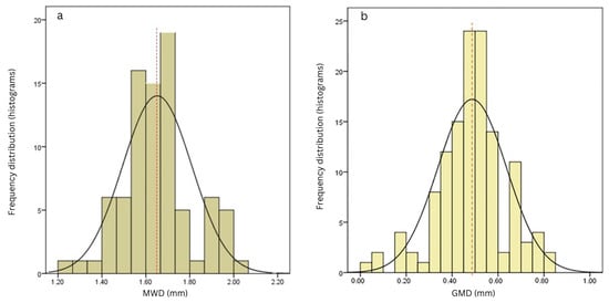 Additionally, a histogram analysis of MWD and GMD across the entire study area revealed that frequency distribution followed a normal distribution with a mean MWD of 1.64 mm and a mean GMD of 0.48 mm (Figure 6) (equal to the mean MWD value of the entire data set) (Table 2). Le Bissonnais [8] classified the stability of aggregates into the five classes of “very unstable”, “unstable”, “medium”, “stable”, and “very stable”, when the values of MWD are <0.4, 0.40–0.80, 0.4–0.80, 0.8–1.3, 1.3–2, and >2 mm, respectively. Based on this classification, most of the soils in our study area are classified as “stable” and “very stable”, which implies they are not prone to a high risk of soil degradation.