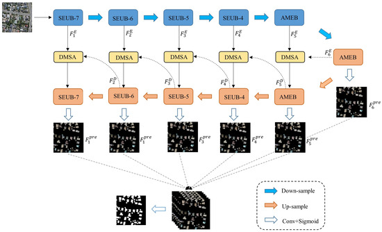 For each image, we first use the encoder to extract multi-scale features at different resolutions, employing four different-sized Squeeze-and-Excitation U-blocks (SEUBs) and two Adaptive Multi-scale feature Enhancement Blocks (AMEBs). The network also integrates Dual Multi-scale Attention (DMSA) between the encoder and decoder, linking low-level features with high-level semantic information, thereby enhancing the inference of global contextual details and enabling a more accurate representation of multi-scale building features. The decoder, consisting of four SEUBs of different sizes and two AMEBs, generates six building footprint outputs that are then aggregated and processed through convolution and activation to produce the final result.