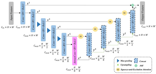 After passing through the SE module, the feature map is aggregated with the feature map of the deep layer. This aggregated feature is then processed through convolution, batch normalization (BN), and ReLU operations to produce . Subsequently, the aggregated feature is combined with the output feature of the shallow layer to generate multi-scale features.