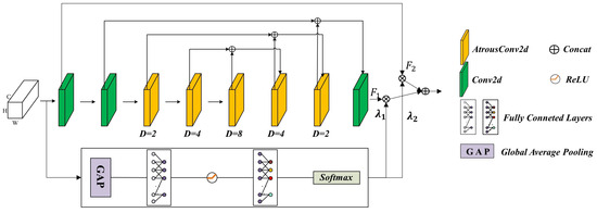 To address this issue, we introduce a large-scale feature extraction module called the Adaptive Multi-scale feature Enhancement Block (AMEB). AMEB, as shown in Figure 4, employs a cascading strategy of multi-scale atrous convolutions. The AMEB introduces a novel branch that enables the network to autonomously assign weights to different receptive field features, thereby reducing randomness in information utilization and enhancing adaptive field selection. After Global Average Pooling (GAP), the feature map F is processed through two fully connected layers and ReLU for adaptation. The Softmax layer then calculates two scaling factors, and , which are applied to the multi-scale feature maps. Finally, the refined high-level feature map is concatenated with the initial feature map to produce the output