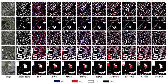 To demonstrate the effectiveness of SEUB, AMEB, and DMSA and explore the superiority of ME-FCN, we conducted extensive experiments. Our network was compared with a variety of methods, including the CNN-based approaches FCN [49], U-Net [36], PSPNet [32], HRNet [50], MANet [51], UNetformer [31], and CMTFNet [29], which are based on the fusion of transformer and CNN, and the transformer-based method DC-Swin [52]. FCN uses the VGG-16 backbone network. HRNet uses HRNet-w18 backbone network. U-Net, PSPNet, MANet, UNetFormer, CMTFNet, and ME-FCN use the Resnet50 backbone network. DC-Swin uses the Swin-S backbone network.