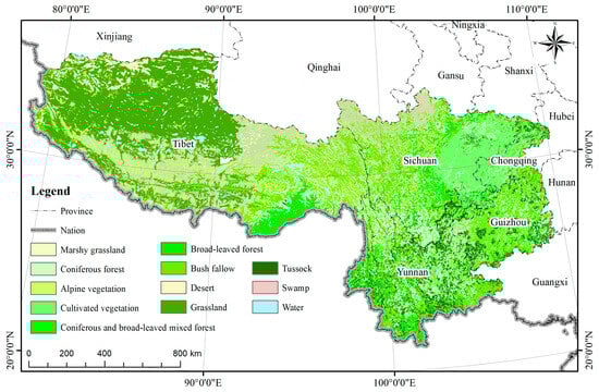 Southwest China, recognized as one of the seven physical geographical divisions of the country, is located between 97°21′ and 110°11′ east longitude and 21°08′ and 33°41′ north latitude (Figure 1). This region comprises Sichuan, Chongqing, Guizhou, Yunnan, and Tibet [31,32,33,34,35]. It is positioned within the primary and secondary echelons of China. The topographical features of this area include the Sichuan Basin, the Yunnan–Guizhou Plateau, and the South Qinghai–Tibet Plateau. As elevation increases from the southeast to the northwest, there is a corresponding gradual decrease in temperature and precipitation. Additionally, the climate transitions from a subtropical monsoon climate to a plateau monsoon humid climate [36].
