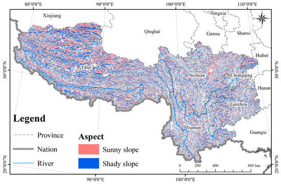The classification of slopes as negative or positive is determined by the orientation of the sun in relation to the mountain’s direction. Given that China is situated north of the equator, the sun predominantly occupies a southerly position. Consequently, the southern aspect of a mountain receives a greater amount of solar radiation, thereby categorizing it as a sunny slope. In contrast, the northern aspect, which is often shielded by the mountain’s elevation, receives significantly less solar energy. This differential exposure to solar radiation creates a marked contrast between the shady and sunny slopes of east–west oriented mountain ranges. Furthermore, the variation in slope orientation leads to the differentiation of other physical geographical factors within mountainous regions (Figure 15, Figure 16, Figure 17, Figure 18, Figure 19 and Figure 20).