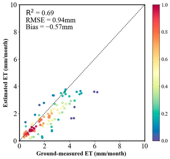 To appraise the performance of the GLASS ET dataset, we compared the monthly estimated results with tower-based data observed by the EC of the flux station (Figure 3). The validation results show that the estimated ET had similar performance on all sites, with a high R2 value of 0.69 and a low RMSE value of 0.94 mm and Bias value of −0.57 mm.