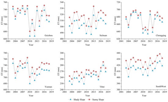 The ET estimates for shady and sunny slopes for each year from 2003–2018 are shown in Table 4. During the study period, the average ET in Southwest China exhibited a slight increasing trend (Figure 4). Overall, the annual ET in this region ranges from 200 mm to 800 mm. The variation in ET on the shady slope aligns with that on the sunny slope. However, a notable difference in ET values is evident. Among the five provinces analyzed, Yunnan demonstrates the highest ET values, with the maximum ET on the sunny slope reaching 764.76 mm and that on the shady slope reaching 747.53 mm. This is followed by Guizhou, Chongqing, and Sichuan. In Tibet, the highest ET values recorded were 285.46 mm on the sunny slope and 279.76 mm on the shady slope.