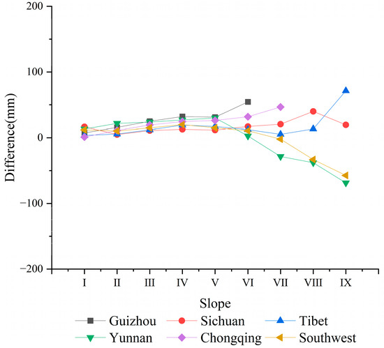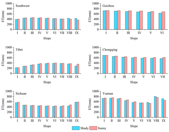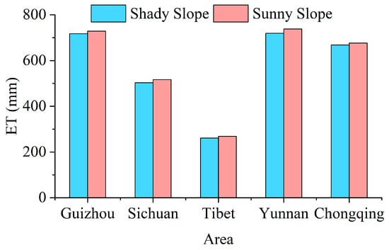 In all provinces, the ET values on sunny slopes surpass those of negative slopes. However, the numerical disparity between shady and sunny slopes varies across regions. The multi-year average ET difference between shady and sunny slopes (Figure 5) indicates that Yunnan exhibits the most significant ET difference, measuring 18.67 mm. Conversely, Tibet demonstrates the smallest ET difference, which is less than 9 mm. Additionally, Sichuan (13.5 mm), Guizhou (10.67 mm), and Chongqing (10.1 mm) also present ET differences between shady and sunny slopes that exceed 10 mm.