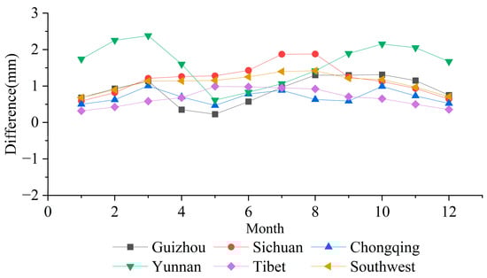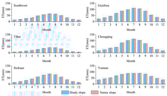 The annual distribution trend of ET in Southwest China and its provinces exhibits consistency (Figure 6). ET values initially increase and subsequently decrease, reaching their peak in July and August, while the lowest values are observed in January and February. In the regions of Yunnan, Guizhou, and Chongqing, the ET differential between shady and sunny slopes demonstrates a bimodal pattern, with elevated values occurring in spring and autumn, and reduced values in summer and winter. On the contrary, in the other regions, the evapotranspiration difference showed an inverted ‘U’ shape, which was consistent with the trend of the monthly mean evapotranspiration (Figure 7). The minimum ET values are recorded in winter, while the maximum values are noted in summer. In all months, evapotranspiration values were higher on sunny slopes than on shady slopes.
