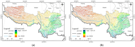 Spatial distribution of ET in entire region: (a) shady slopes; (b) sunny slopes.