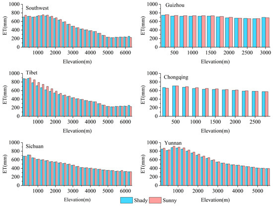 The variation of ET at different altitudes in the study area (Figure 10) showed a decreasing trend in ET values with increasing altitude. Overall, ET decreased gradually with increasing altitude in the altitude range of 0 m to 5000 m. ET on sunny slopes consistently exceeded that on shady slopes. However, when the altitude was higher than 5000 m, ET on shady slopes was greater than that on sunny slopes as the altitude increased in Tibet. It is noteworthy that in Yunnan, ET did not reach its maximum at the lowest elevation, but rather at 750m to 1250m.