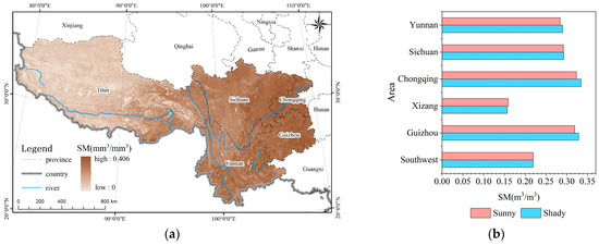 Distribution of SM: (a) spatial distribution; (b) numerical statistics of SM for shady and sunny slopes.