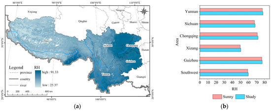 Distribution of RH: (a) spatial distribution; (b) numerical statistics of RH for shady and sunny slopes.