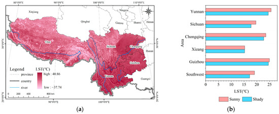 Distribution of LST: (a) spatial distribution; (b) numerical statistics of LST for shady and sunny slopes.