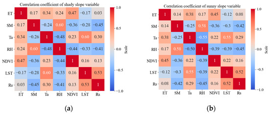 (d) A positive correlation was found between ET and NDVI, SM, RH, and Ta. Conversely, a negative correlation was observed between LST and ET. The effects of SM, NDVI, RH, and LST on ET are more substantial on shady slopes than sunny slopes, whereas Ta has a stronger impact on ET on sunny slopes.