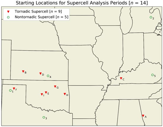 A map showing the approximate starting location of the observation period for each storm in this study. Red triangles indicate tornadic storms, and green circles indicate nontornadic storms. Letter or number next to each storm location corresponds to the storm identifiers in Table 1.