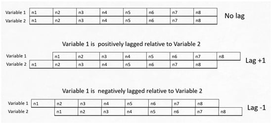Schematic demonstrating how lag was applied to two metrics being compared for both a positive and negative lag.