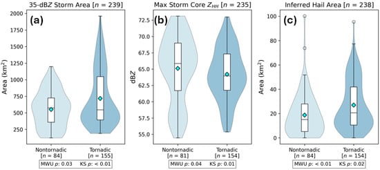 The 35 dBZ storm area (Figure 3a) was slightly larger in the tornadic storms in the sample, with median values of 546.6 km2 (tornadic) and 574.7 km2 (nontornadic). This finding is not operationally useful, however, but is consistent with prior results [38] and further confirms that the areal coverage of storm echo does not effectively distinguish tornadic and nontornadic storms. The median value of maximum ZHH in the storm core was ~2 dBZ larger for nontornadic storms (64.0 dBZ vs. 65.9 dBZ; Figure 3b), a significant difference (p = 0.01 for the KS test and p = 0.04 for the MWU test). The median inferred hail area was larger in the tornadic storms (20.7 km2 for tornadic storms and 15.2 km2 for nontornadic storms; p < 0.01 for the MWU test and p = 0.02 for the KS test, Figure 3c). This result is consistent with prior work [5,38].