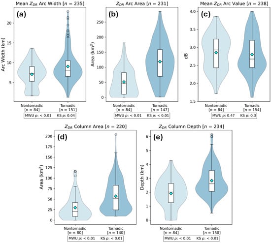 Median ZDR arc and column characteristics were examined next. The ZDR arc was slightly wider in tornadic storms, though part of the difference was attributed to several scans with very wide arcs in those storms (Figure 4a). ZDR arc area was significantly larger in tornadic scans (by ~80 km2; Figure 4b) as indicated by MWU and KS tests (p < 0.01 for each). The mean value of pixels within the arc was larger in nontornadic storms by ~0.3 dB, though this was not a significant difference by either statistical test (Figure 4c). This result indicates that, for this sample of storms, the ZDR arc area may be a better metric to distinguish potentially tornadic and nontornadic supercells than the other ZDR arc metrics tested.