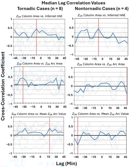 Median correlograms for ZDR column area compared to other polarimetric radar metrics (blue lines): inferred hail areal extent at base scan (km2; row 1), the mean area of the ZDR arc (km2; row 2), and the mean value of ZDR within the ZDR arc (dB; row 3). The left column shows median correlograms for the 8 tornadic storms, and the right column shows median correlograms for the 4 nontornadic storms. The X-axis indicates lag correlation in minutes. The vertical red line indicates the time of maximum correlation magnitude.