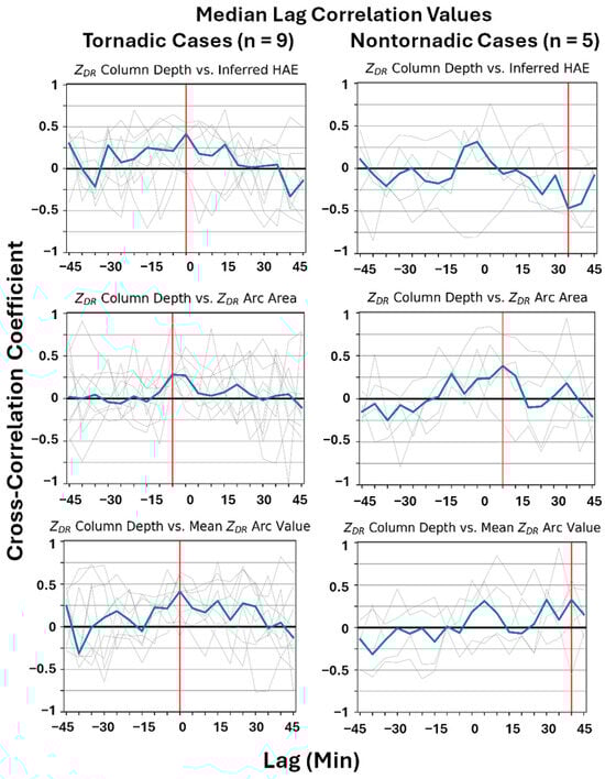 Temporal associations of the radar metrics were assessed using Pearson cross-correlation values. The ZDR column depth and ZDR column areal extent were the independent variables, and the remaining radar metrics were the dependent variables. For the purposes of this study, a lag of up to 45 min (approximately 9 volume scans, based on an average of 5 min per complete volume coverage pattern scan) was applied to the metric comparisons in both directions of the zero offset (Figure 2). Lag was introduced to test the results of prior studies [14,31,32], which demonstrated a physical relationship between updraft tendencies and precipitation fallout and intensity at a temporal offset of 15–30 min. Correlation values were calculated for each metric comparison within each storm and for each metric comparison in both tornadic and nontornadic samples (e.g., a cross-correlation coefficient was calculated for the ZDR column depth vs. ZDR arc area metric comparison using all available sample scans from tornadic storms at each given lag). However, due to the variation in the length of observation periods, the number of total sample scans included in the cross-correlation calculation decreased for each successive lag interval. Among the storm-based correlation testing, a small number of storms had observation periods long enough to determine correlation values over a full 45 min lag period. For metric comparisons using the ZDR column area as an updraft proxy, a total of 12 storms (8 tornadic and 4 nontornadic) had observation periods that were long enough and had sufficient data quality within the ZDR column (Table 1). There were 14 storms (9 tornadic and 5 nontornadic) with sufficient quality and temporal extent for comparisons using ZDR column depth as an updraft proxy (Table 1). From these storms, a median correlogram was created for both tornadic and nontornadic samples.
