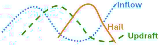 The hypothesized general relationship between updraft intensity (green dashed line), storm-relative inflow (leading an updraft pulse; blue dashed line), and hail area (lagging an updraft pulse; solid orange line) in supercell storms.