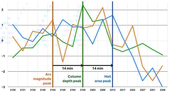 Figure 8 shows time series plots of differences between the mean value of several parameters and the value at each radar scan time. Values > 0 indicate that a variable was larger (e.g., ZDR column depth was greater) at that analysis time than the long-term mean, while values < 0 indicate that a variable was smaller (e.g., hail area was less) than the long-term mean. An early peak in ZDR arc magnitude (2145 UTC; vertical orange line) is followed ~14 min later by a strong peak in ZDR column depth (2159 UTC; vertical green line). Then, ~14 min later, there is a peak in the hail area (2213 UTC; vertical blue line). While the progression of these features varies from storm to storm, this example is representative of what might be seen on average across a larger sample of storms.