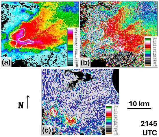Radar image from KFFC at 2145 UTC on 18 March 2013, when the storm centroid was ~35 km from the radar. (a) shows a 300 m CAPPI of ZHH, (b) shows a 300 m CAPPI of ZDR, and (c) shows a 5000 m CAPPI of ZDR. White annotations in (a,b) indicate radar-inferred hail, and white annotation in (c) indicates the ZDR column area at 5 km above radar level.
