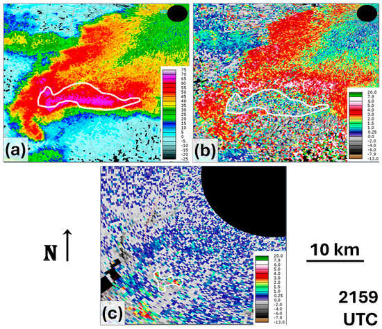 Another recurring supercell polarimetric feature is the ZDR arc, a band of enhanced ZDR values along a supercell’s forward flank (inflow side). This feature is typically shallow, occurring in the lowest 1–2 km, and often has ZDR values exceeding 4–5 dB [5,27]. The mean storm-relative wind in the storm’s inflow layer appears to be a dominant indicator of the size sorting, which leads to the presence of a ZDR arc [28]. Characteristics of the arc may change cyclically, including increasing curvature during mesocyclone organization and decreasing curvature in the post-tornado phase as a mesocyclone weakens and reorganizes [22,29].