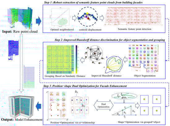 This paper introduces a novel approach for identifying and optimizing the semantic structure of windows from building facade point clouds. Specifically tailored for complex high-rise buildings commonly encountered in urban management, the method starts with local semantic recognition to derive an optimized window layout for the entire facade, thereby enhancing LOD1/2 models that lack detailed facade information. The approach consists of three key steps: (1) the robust extraction of semantic feature point clouds from the facade; (2) the optimization of object clustering based on the Hausdorff distance; and (3) facade enhancement through a dual-layer optimization of shape and position. Figure 1 provides an overview of this comprehensive framework.
