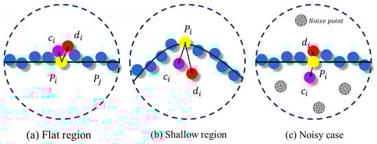 Specifically, we first calculate point features using traditional methods, as shown in Figure 2a. For a point pi in the point cloud, we obtain its neighborhood point set p based on the optimal neighborhood radius r and fit its centroid as . We define the vector , and the larger the magnitude of this vector , the more complex the local shape of its neighborhood. However, since is a uniform Laplacian vector, its weight strategy is insensitive to surface changes, which limits its effectiveness in describing complex and detailed facade semantic structures. As shown in Figure 2b, in flat areas and shallow structural regions, the vectors from points to the centroid are small and indistinguishable, whereas as shown in Figure 2c, under noise interference, the vectors from points to the centroid lengthen, potentially misidentifying pi as a feature point.