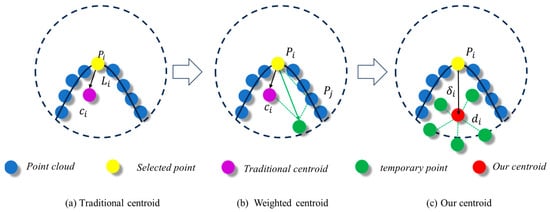 Here, , where represents the set of nearest neighboring points of point , and denotes the average distance between and all its neighboring points. The locally weighted centroid displacement scheme enhances the differences between points in shallow features and those in flat areas by considering the relative positions of points to their neighbors.