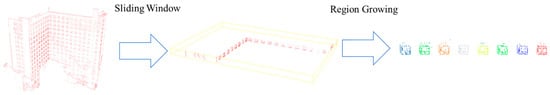 At the onset of processing, we initially employ the region growing method to segment the obtained facade semantic feature point cloud U into individual object. Since common attachments on building facades, such as long pipelines and drying clothes, can interfere with the effectiveness of the region growing algorithm, we first slice the point cloud U vertically. The initial thickness of the slices is set based on common building floor heights and is refined through a sliding window algorithm that adjusts the slice thickness for different levels, gradually optimizing until each slice fully covers all areas of the same floor. Subsequently, the region growing algorithm is applied to each floor slice for preliminary segmentation, and the segmentation results of each slice are merged to form an overall preliminary object segmentation. Ultimately, we obtain several semantic object point cloud clusters, denoted as , where i represents the number of segmented semantic objects. As shown in Figure 4.