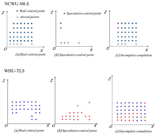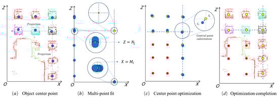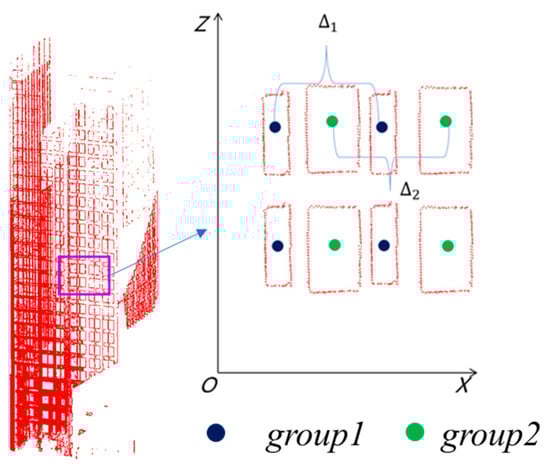 Based on the segmentation results of the windows, the target center points (blue points ) are obtained. By projecting these points onto the X and Z axes and fitting them to lines (, ), the intersection of these lines represents the optimized window position (yellow points ). Furthermore, the previously obscured window structures in the point cloud can also be inferred (red points), as shown in Figure 6b. The corresponding co-row and co-column lines can be expressed as follows.