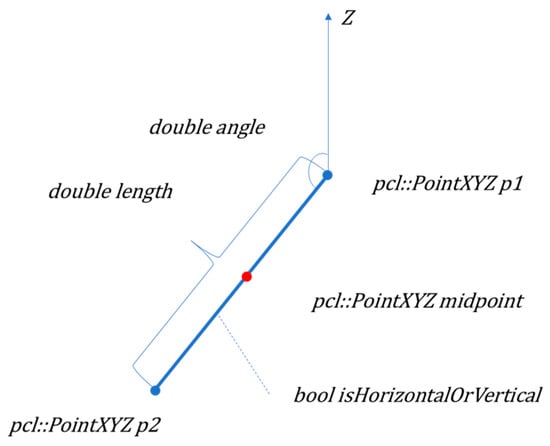 We created a class LINE to store and represent the parameters of a line segment, as shown in Figure 8. translates angular differences into a length representation, where represents the angle between line segments and . denotes the perpendicular distance, which is a method that comprehensively considers distance and mitigates the impact of extreme values. Here, and represent the projection distances from the two endpoints of line segment to line segment . quantifies the distance between two line segments by calculating the distance between their projected endpoints, where indicates the minimum distance between the endpoints of the two line segments. Generally, if two line segments and are similar, the similarity metrics will have smaller values. In other words, a smaller value implies that line segments and are more similar, as shown in Step 2 of Figure 9.