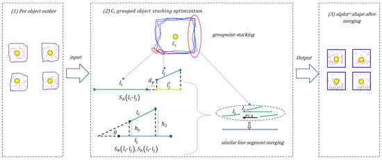 Subsequently, based on the grouping results of , each group is processed individually. For any group, based on the optimized object center point as the insertion anchor point, the obtained contour boundary is superimposed, and the line segments are measured for similarity and merged. Specifically, we first define a metric to measure the similarity between two adjacent line segments as follows: