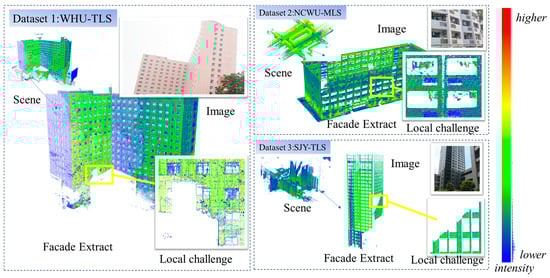 The WHU dataset is publicly accessible (https://github.com/WHU-USI3DV/WHU-TLS (accessed on 27 October 2023). Due to the significant distance of the terrestrial laser scanner from the buildings, there is considerable variation in point cloud density, which results in less distinct detail features. The NCWU dataset was acquired using a backpack-mounted laser scanner, and the building facades are heavily occluded by attachments such as clothing and pipes. When collecting the SJY dataset with a terrestrial laser scanner, limitations in scanning angles led to large areas of missing data. Each of these datasets presents significant challenges for window extraction. More detailed information about the datasets can be found in Table 1 and Figure 11.