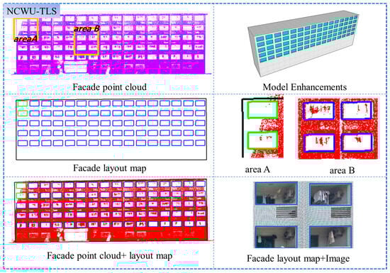 Figure 12 illustrates the experimental outcomes from the NCWU dataset, encompassing the original facade point cloud, the extracted facade layout, and a composite view of both for a clearer comparison. Additionally, it showcases the facade enhancement results for the LOD1 model. Within this dataset, two representative areas, A and B, were selected for analysis. Area A, which has defects in laser scanning, still yields a complete layout in the extracted map. Area B demonstrates the overlay effects of the extracted windows with laser scans and photographs, visually confirming the detection accuracy of the proposed algorithm. The results from the other two datasets can be seen in Figure 13.
