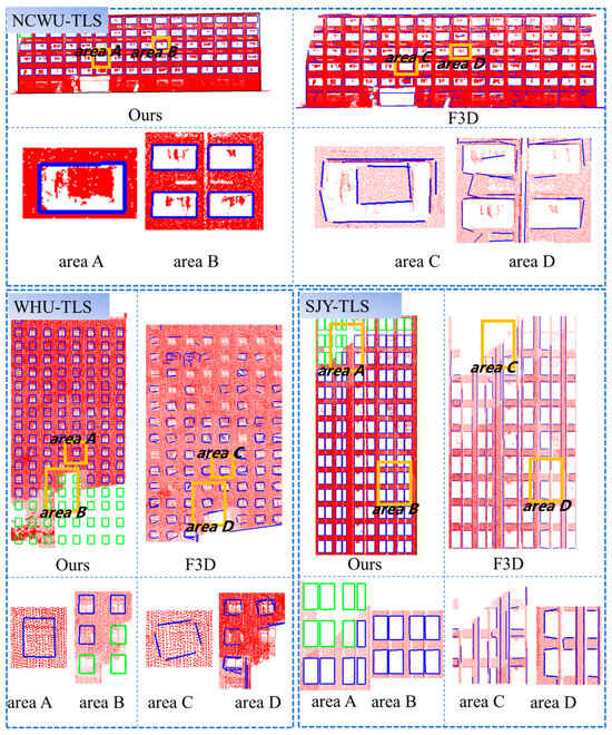 In the WHU-TLS dataset, the proposed method in this paper achieved a correct rate of 98.5%, which is significantly higher than the 62.6% of the F3D method. On the other two datasets, the proposed method achieved correct rates of 85.1% and 88.0%, respectively. Moreover, the dual optimization of position and shape adopted in this paper maximizes the avoidance of missed detections. In addition, all detected window line segments are closed, whereas those detected by the F3D method may have missing segments or be non-closed, as shown in areas C and D of Figure 14.