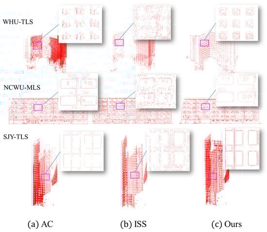 In the F3D method [47], the process begins with segmenting the point cloud into three-dimensional planes through region growing. Following this, the three-dimensional planes are projected onto two-dimensional images. Finally, the contours extracted from the two-dimensional images, which are two-dimensional line segments, are re-projected onto the three-dimensional planes to obtain the corresponding three-dimensional line segments. In the ISS method [48], the shape descriptor of Intrinsic Shape Signatures (ISS) is introduced to describe the local/semi-local areas of point clouds. An intrinsic shape signature uses a view-independent representation of the 3D shape to match shape patches from different views directly, and a view-dependent transform encoding the viewing geometry to facilitate fast pose estimation, in order to accurately distinguish feature points. In the AC method [49], the edge structural feature points of the point cloud are detected by studying the properties of the point set. For each point, we combine several criteria into an integrated boundary probability. A final boundary loop extraction step uses this probability and exploits additional coherence properties of the boundary to derive a robust distance and identify the structural feature points in the point cloud.