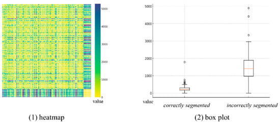 To obtain authentic and reliable window semantic details, it is essential to accurately judge the correctness of windows. The obtained from region growing mainly include two types: (1) windows with complete segmentation results, which have a small improved Hausdorff distance between them and exhibit higher similarity, and (2) windows that are either noise points or incorrectly segmented, which show a significant difference in the improved Hausdorff distance from normal windows. As shown in Figure 16 (1), the window matrix is a symmetric matrix where the horizontal or vertical axis represents a point cloud cluster , and the color of each cell is a quantified value of the improved Hausdorff distance; the darker the color, the lower the similarity. Those that have a significant difference from every row (column) can be identified as noise and will be excluded in subsequent processing. The box plot in Figure 16 (2) illustrates the distribution of the improved Hausdorff distances for normal and incorrect . The length of the box can reflect the central tendency and dispersion of the data. The closer the bottom and top of the correctly segmented windows, the more concentrated the improved Hausdorff distances of this group of are, indicating a lower degree of dispersion and higher homogeneity, likely originating from similar groups or conditions, thus showing less variation. In contrast, incorrectly segmented windows exhibit a significantly higher degree of dispersion, which under the conditions of this paper suggests that correctly segmented windows is more likely to consist of completely segmented windows, while incorrectly segmented windows consists of noise and incorrectly segmented windows. The points represented by small circles are outliers, indicating extreme values. It can be observed that the outliers for normal windows are smaller, while the data for noise points shows higher outliers. In this paper, a higher outlier value indicates that the point cloud cluster is more likely to be a noise or segmentation failure point.