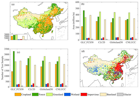 The composition of land cover types and spatial distribution of validation samples. (a) Validation samples used in assessing the classification accuracy of land cover products; (b) the total area of land cover types for products; (c) the number of validation samples for land cover types; (d) validation samples are generated by stratified random sampling based on land cover types.